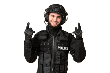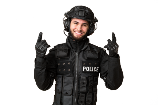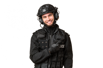 SWAT over isolated chroma key background pointing finger to the side and presenting a product