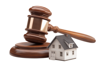 Miniature house, gavel, and coins; likely foreclosure or real estate legal matter