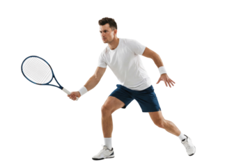 Male tennis player in white t shirt hitting forehand isolated on white