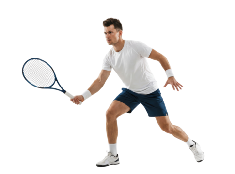 Energetic tennis player hitting forehand isolated on a clean background