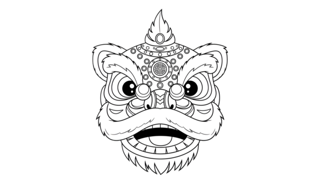 A black and white illustration of a lion dance head with intricate designs and patterns on its face and forehead in a traditional style isolated on transparent background