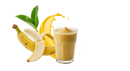 Delicious Banana Smoothie in a Glass with Fresh Bananas and Green Leaves, Healthy Refreshing Drink
