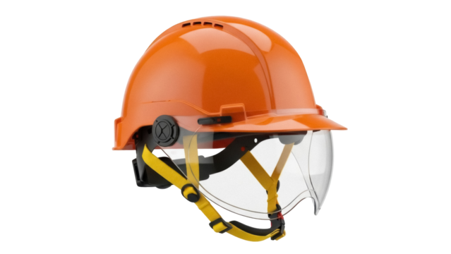 Isolated orange protective hard hat with clear visor provides essential head and eye protection