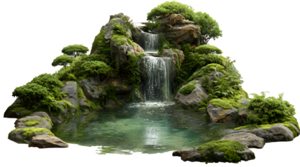 A picturesque waterfall cascading over moss-covered rocks into a clear forest pool, surrounded by lush, vibrant greenery, isolated on a Transparent background