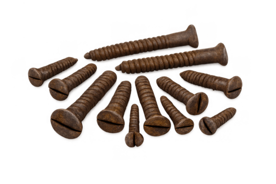 Collection of old rusty slotted flat head wood screws, creating a fan shape and showcasing corrosion. Transparent background
