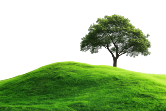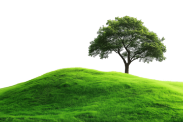 Green grass fields and mountains isolated on a transparent background.