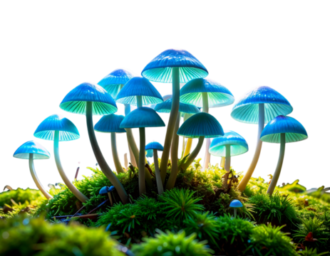 “Glowing Forest Mushrooms with Sunlight Rays Through Trees, isolated on a transparent background”