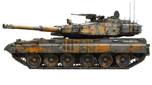 side view Military tank with camouflage paint and a large cannon isolated on transparent background, generative ai