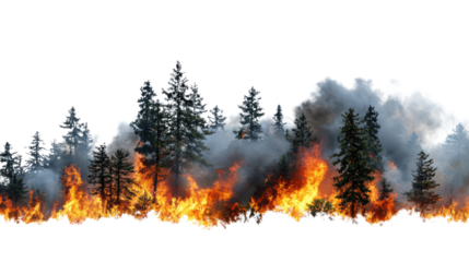 A dramatic scene of wildfires engulfing a forest, showcasing intense flames and thick smoke rising amidst tall trees, illustrating the destructive force of nature.