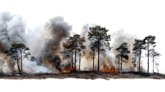 Forest fire with thick smoke rising among trees, creating a dramatic scene of natural disaster and environmental impact, isolated on a white background.