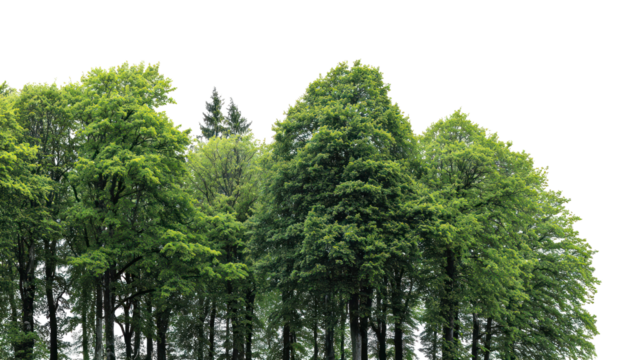 Cutout tree line. Forest and green foliage in summer. Row of trees and shrubs isolated on transparent background. Forest scape. High quality clipping mask