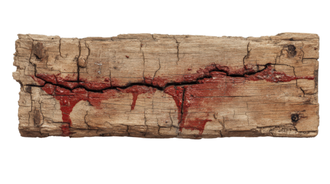 Ancient wooden warning sign cracked and bloodied, Transparent background, PNG file