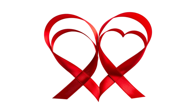 Two red ribbon hearts intertwined on a black background, representing love and awareness