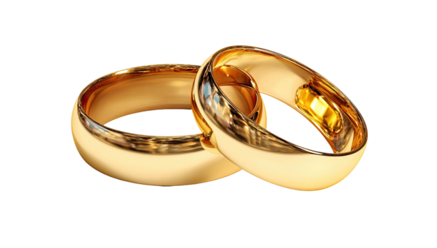 Elegant gold wedding bands entwined, symbolizing eternal love, commitment, and celebration on transparent background