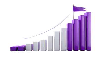 Purple and white bars show a steep upward trend towards a flag, symbolizing business success isolated on transparent background