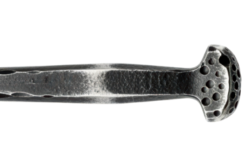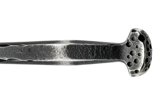 Close up of a hand forged iron nail with a unique pitted head isolated on transparent background