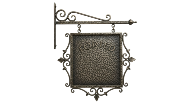 Forged metal sign isolated PNG on transparent background, vintage style signboard with decorative bracket for shop or restaurant