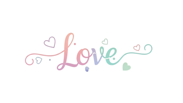 Handwritten word Love in pastel gradient colors with decorative hearts and swirls.