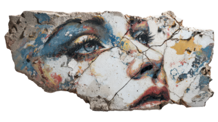 Woman's face graffiti fragment revealing street art expressions on cracked concrete wall, transparent background