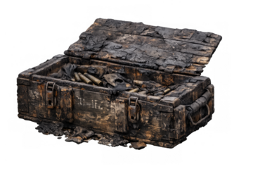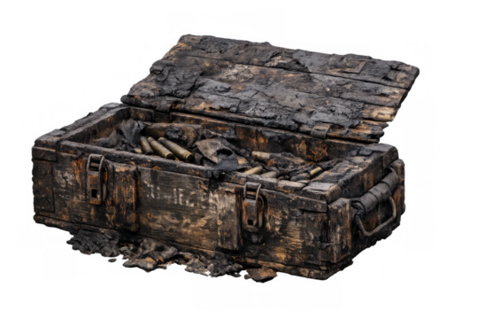 Burnt military ammunition box filled with cartridges