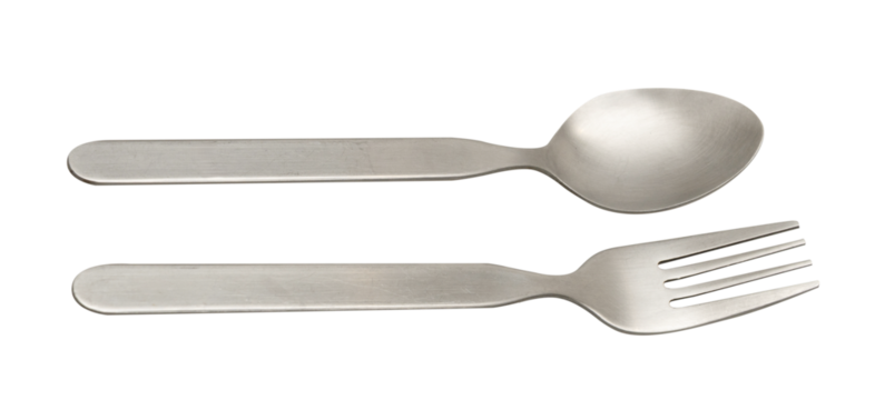 Close-up of a stainless steel fork and spoon placed side by side, isolated on white background, symbolizing dining and kitchen utensils