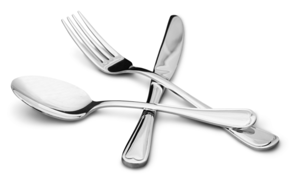 stainless steel knife spoon and fork with white plate isolated on transparent background PNG image