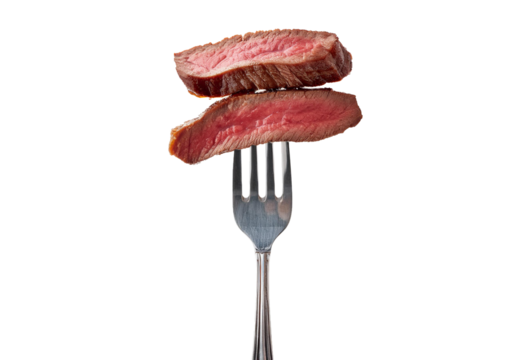 Slices of beef steak on vintage fork isolated on transparent or white background