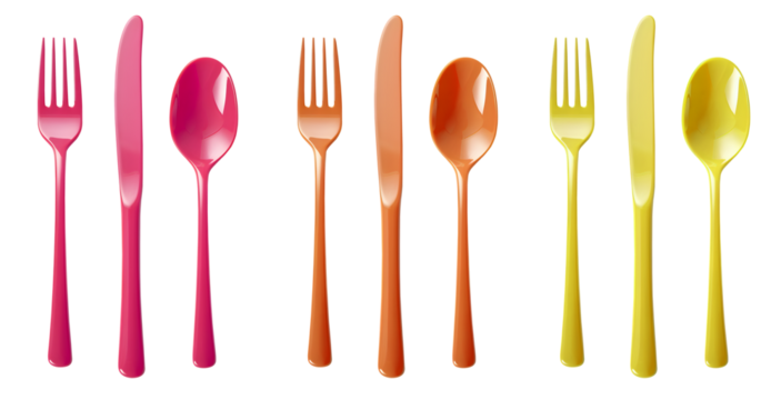 Set of Cutlery of plastic disposable colourful party spoon, fork knife on transparent background cutout, PNG file. Mockup template for artwork design. pink magenta, orange, yellow