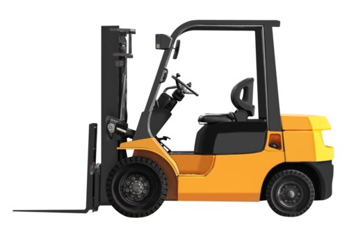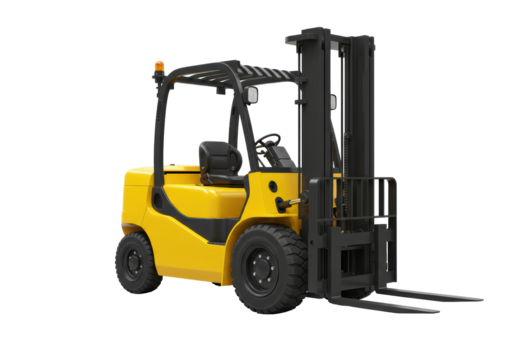 Yellow forklift with black forks and a seat. Suitable for industrial, construction, warehouse, logistics, and transportation themes