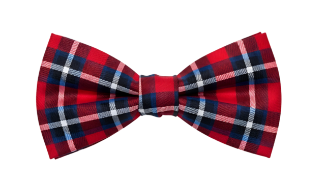 A vibrant red plaid bow tie featuring black and blue accents on a dark background