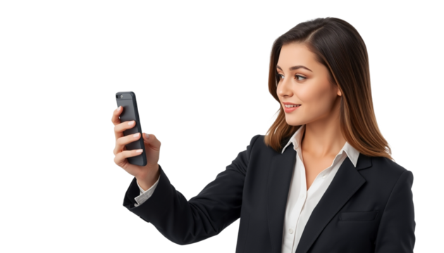 A businesswoman taking a selfie with her smartphone on transparent background