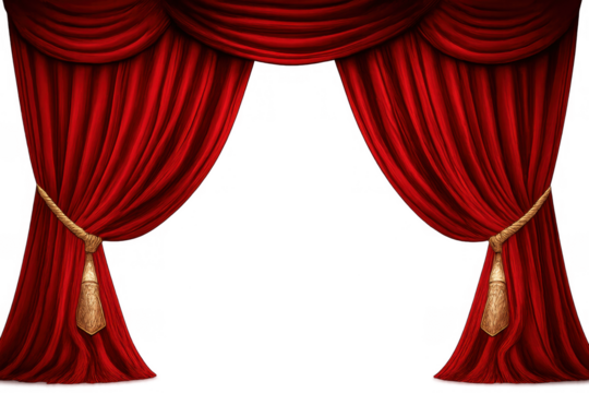 Red velvet stage curtains opening, decorated with golden tassels and ropes, creating a luxurious theatre backdrop on a transparent background