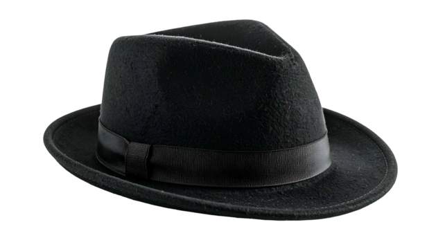 Black felt fedora with a dark band around the crown, casting a slight shadow