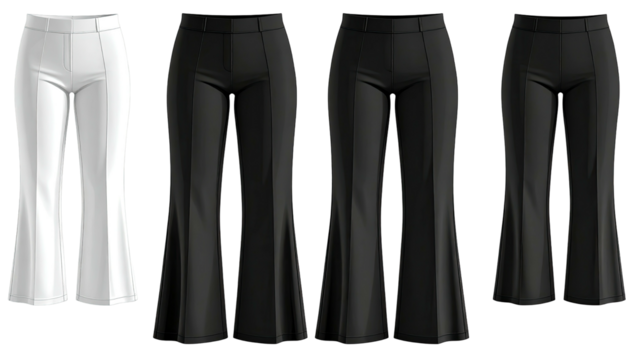 Three variations of black trousers, from straight to flared, on a dark background