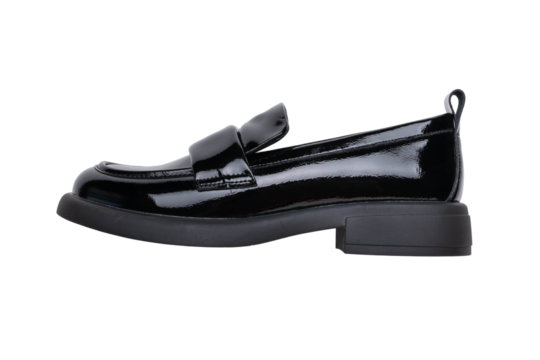 Hand holding a pair of polished black formal shoes for men, sleek and professional, isolated on white background PNG transparent.