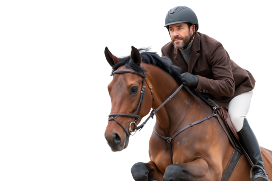 Elegant male equestrian in formal attire riding a bay horse during a show jumping competition