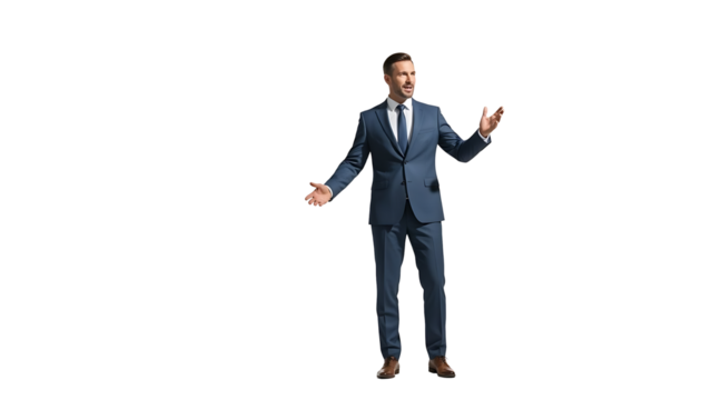 Elegant business man in stylish blue suit gesturing with both hands, appears confident and charismatic.