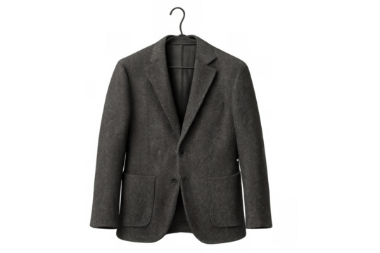 Grey wool blazer jacket for men hanging on a hook, presenting formalwear fashion with transparent background