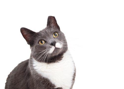 Mustache cat looking up. Isolated cute curious gray tuxedo cat waiting for food or watching something. Male short hair cat with tipped left ear, former stray. Selective focus.