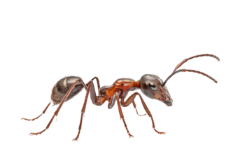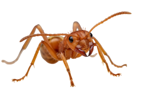 Closeup macro photograph of a single red ant isolated on transparent background, showcasing intricate details of its segmented body, antennae, and legs, highlighting its exoskeleton and compound eyes