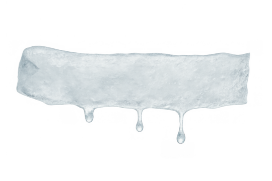 Ice block melting with water drops forming at its base, representing winter's end and the thawing process. Transparent background