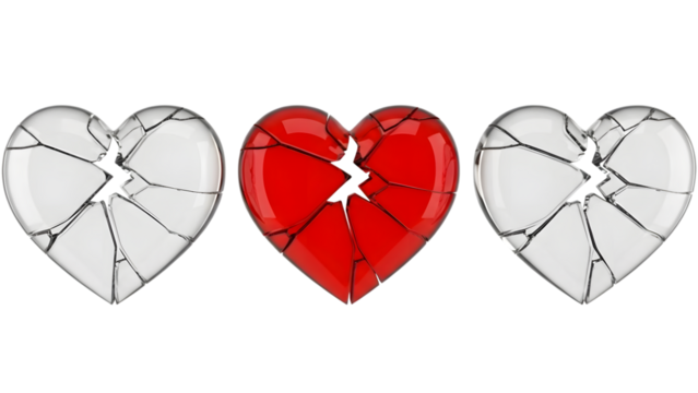 Three heart shapes with cracks, one red and two silver, symbolizing broken love or relationships isolated on a transparent background