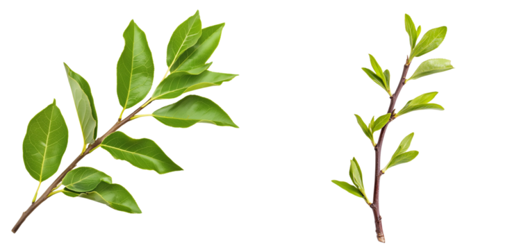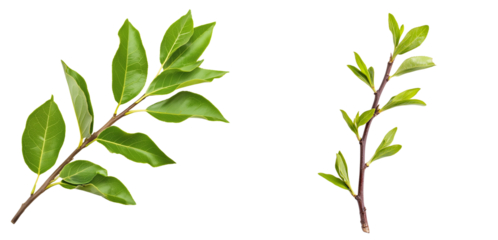 Set of A single young forsythia twig with vibrant green leaves transparent png background. Ai generated