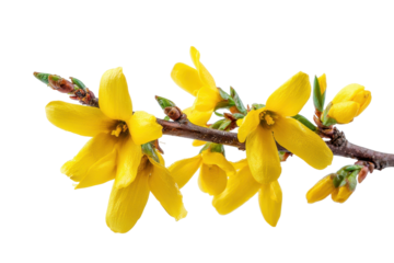 Vibrant yellow forsythia flowers blooming on a delicate branch isolated on transparent background