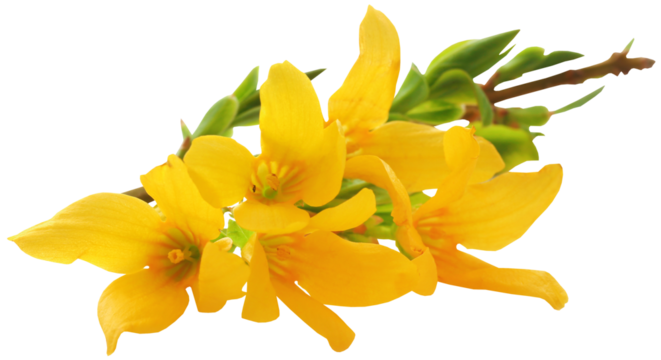 Forsythia yellow flowers blooming in spring, bright blossoms creating a vibrant floral cluster, cut out with transparent background
