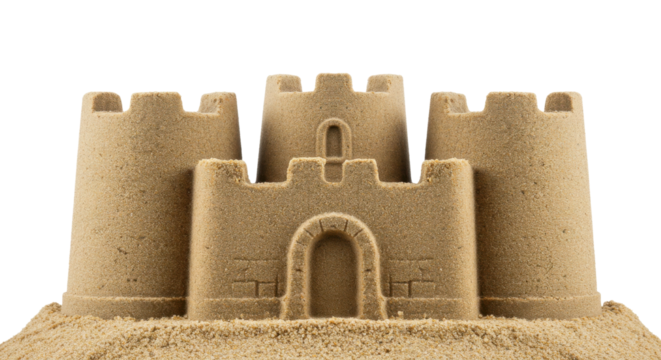 A detailed sand castle depicting a majestic fort with towers, spires and turrets, on a beach