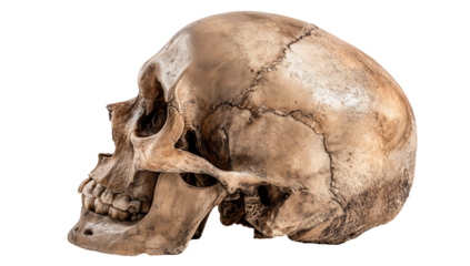 Detailed human skull anatomy, showcasing bone structure and cranial sutures for medical illustration on transparent background