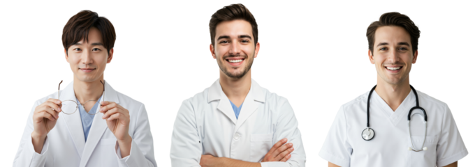 Three Male Healthcare Professionals: Diverse Group of Doctors in Lab Coats for Medical and Health Themes