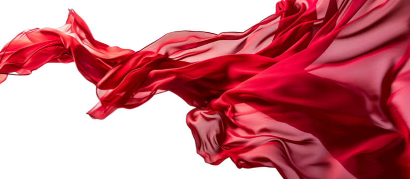 Flying red silk fabric. Waving satin cloth isolated on transparent background.