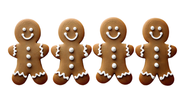 Set of four gingerbread cookies decorated with white icing on transparent background